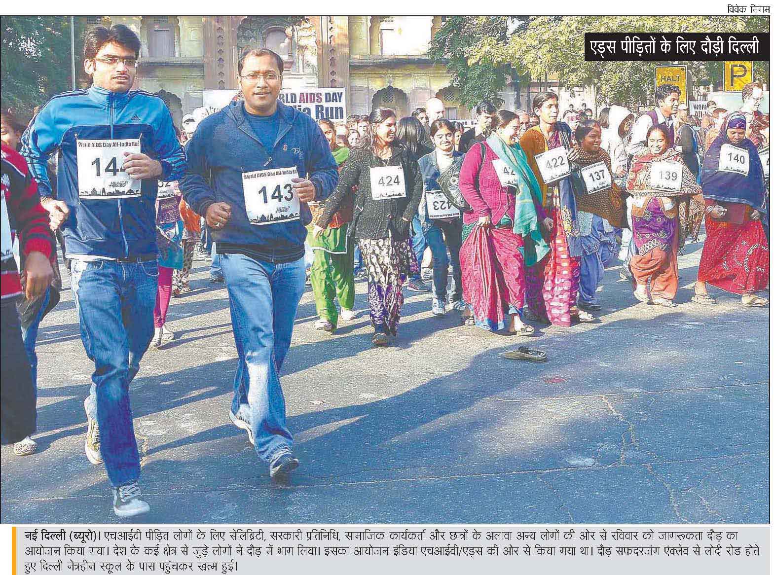 Hindi newspapers that covered the World AIDS Day All-India Run & Cultural Event include: Dainik Bhaskar, Amar Ujjala, Rashtriya Sahara, Aaj Samaj, Mahamedha, Voice of Politics, Dainik Bharati, Dainik Nav Jyoti, Qaumipatrika, Amrit India and Adhikar.(Click on images of the clippings to enlarge.)